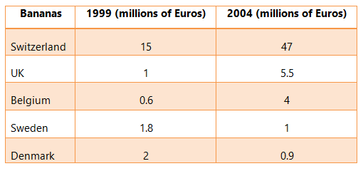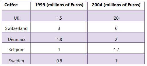 Question – The tables below give information about sales of Fairtrade-labelled coffee and bananas in 1999 and 2004 in five European countries.